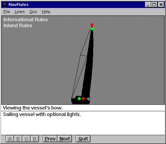Logiciel d'apprentissage des régles de barre et signalisation NavRules est un programme pour l'apprentissage des régles de barres, feux et pavillons réalisé par les gardes côtes americains. Il dispose d'un mode apprentissage et d'un mode entraînement (quizz). C'est un shareware ; il peut être utilisé durant une période d'essai de 30 jours, au delà il faut s'enregistrer (20$). Pour utiliser Navrules il faut saisir les données suivantes : |
